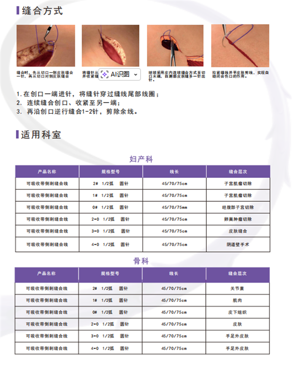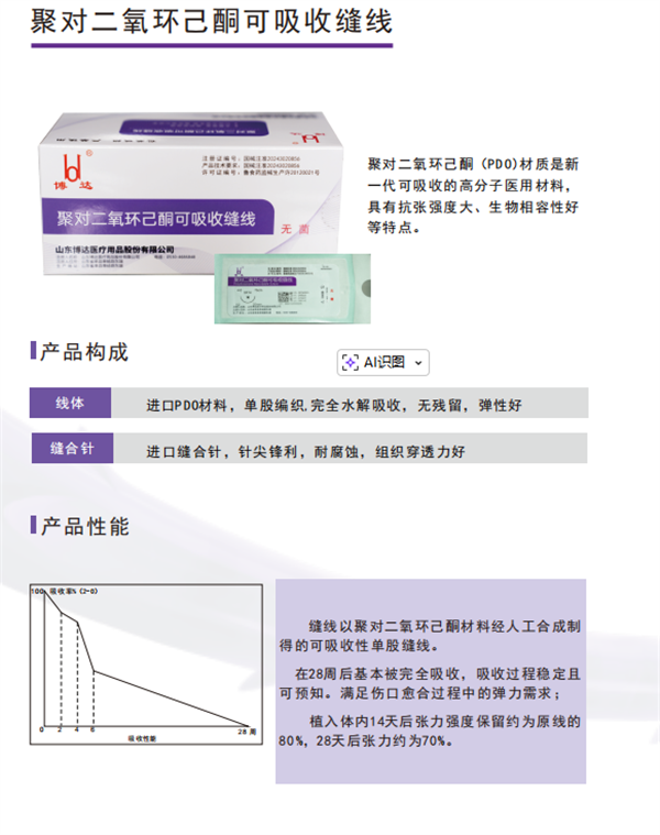 1.聚对二氧环己酮(PD0)材质是新一代可吸收的高分子医用材料,具有抗张强度大、生物相容性好等特点。缝线以聚对二氧环己酮材料经人工合成制得的可吸收性单股缝线。